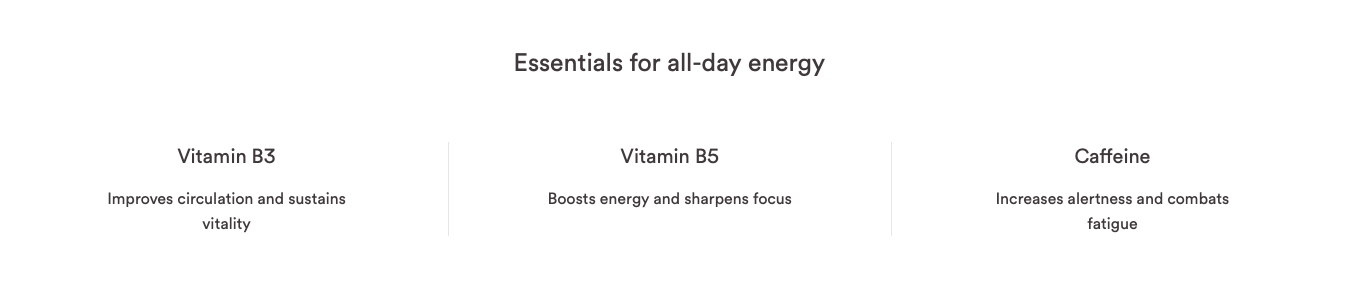 Caffeine 3.12mg, Vitamin B1 (Thiamine Mononitrate) 1.2mg, Vitamin B2 (Riboflavin) 1.3mg, Vitamin B3 (Nicotinamide) 12mg, Vitamin B5 (Calcium D-Pantothenate) 5mg, Vitamin B6 (Pyridoxal 5-Phosphate) 1.7mg, Vitamin B12 (Methylcobalamin) 600mcg, Vitamin B9 (Folate as 5-MTHF L-Methylfolate) 40mcg, Vitamin B7 (Biotin) 30mcg